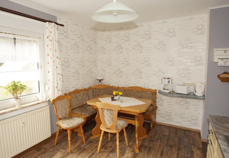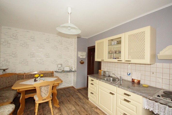 komplett eingerichtete Küche mit Kühlschrank, E-Herd, Kaffeemaschiene, Toaster, Wasserkocher,